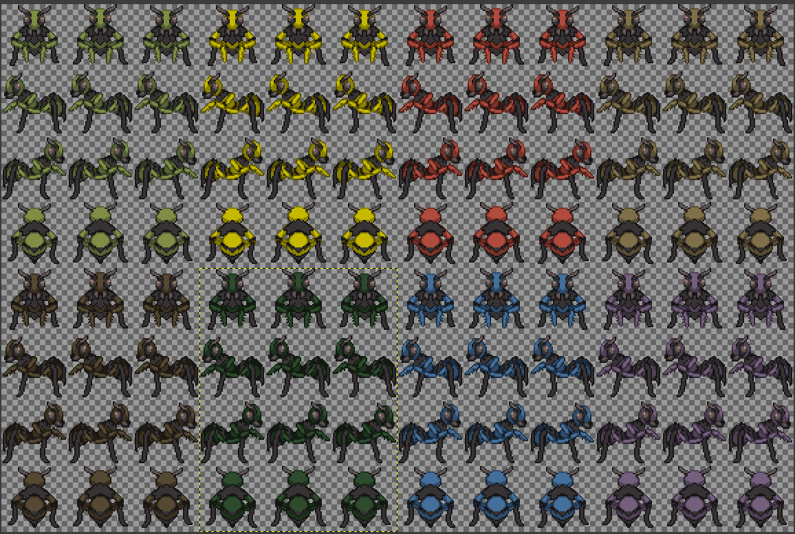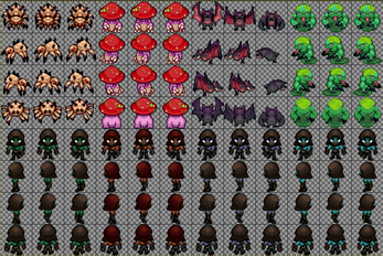 4-directional map sprites (Excluding the Worm) 48x48px Bat, Mole, Goblin. 96x96px Orc. 144x144px Worm.
